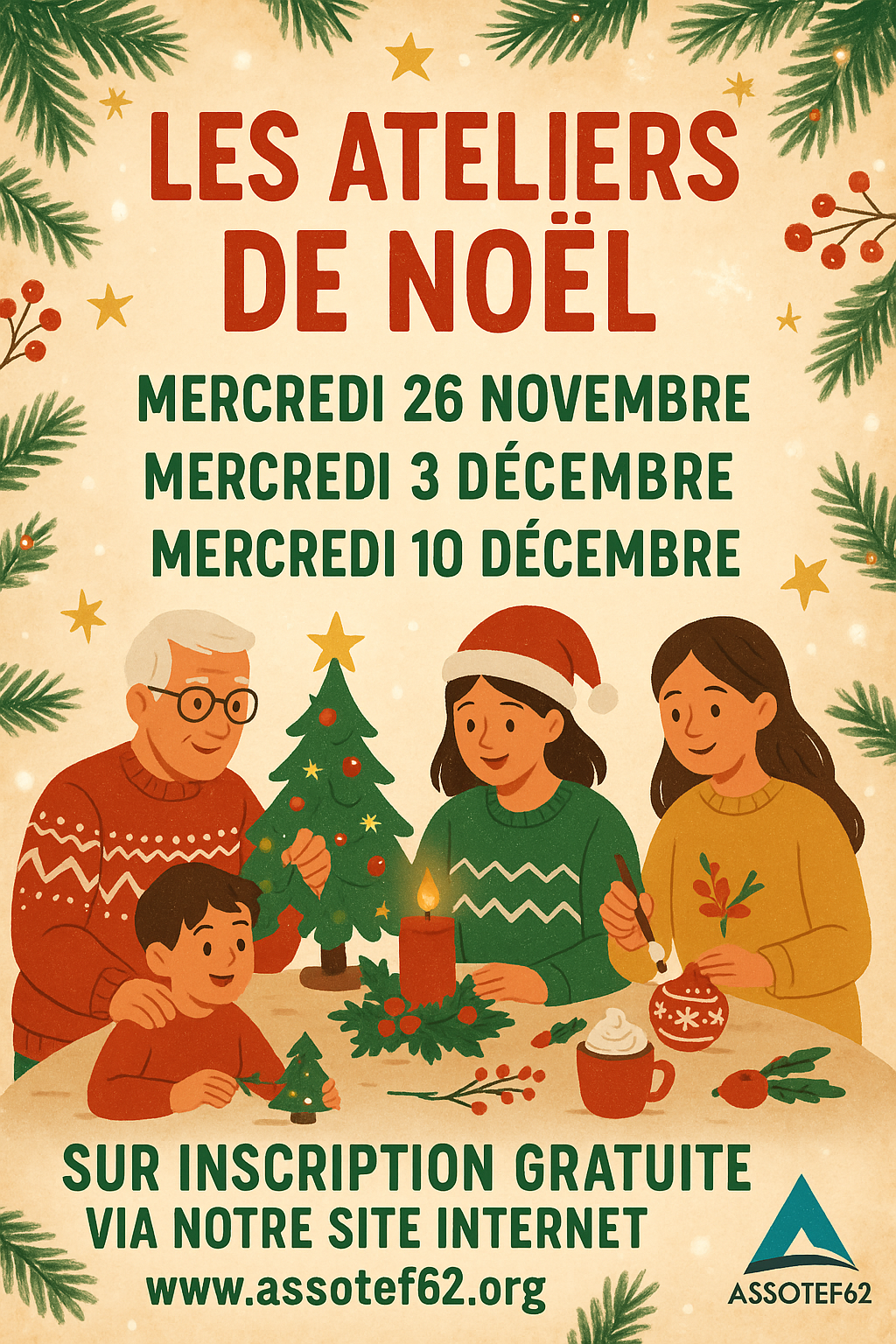 La participation aux Ateliers de Noël ASSOTEF 62 est gratuite, mais l’inscription est obligatoire afin de garantir une bonne organisation et le confort de tous 🎁✨